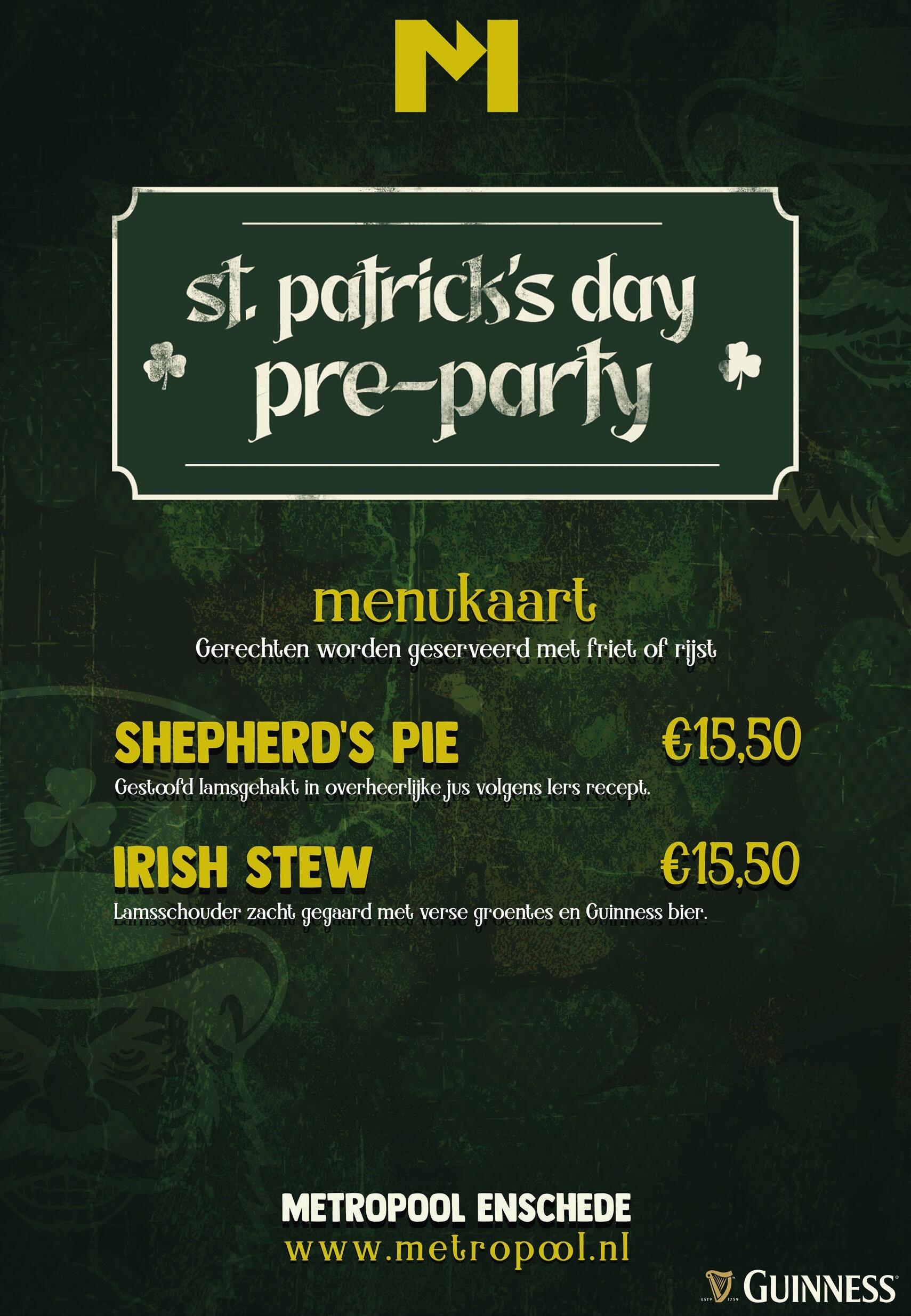 Wil je tijdens de St. Patrick's Day Pre-Party een hapje eten? Dat kan! We hebben zelfs een speciale menukaart voor deze avond. Bekijk de menukaart hier.