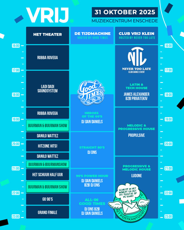 Op vrijdag 31 oktober 2025 is het weer tijd voor VRIJ, de vrijdagmiddagborrel die nét even verder gaat. Hier luid je het weekend in met goede muziek, lekkere drankjes en een relaxte sfeer. Of je nou langskomt met collega’s, vrienden of gewoon zin hebt in een goede avond: VRIJ is de plek om samen de vrijdagmiddag te vieren. Zet ‘m in je agenda, trommel je crew op en kom langs!