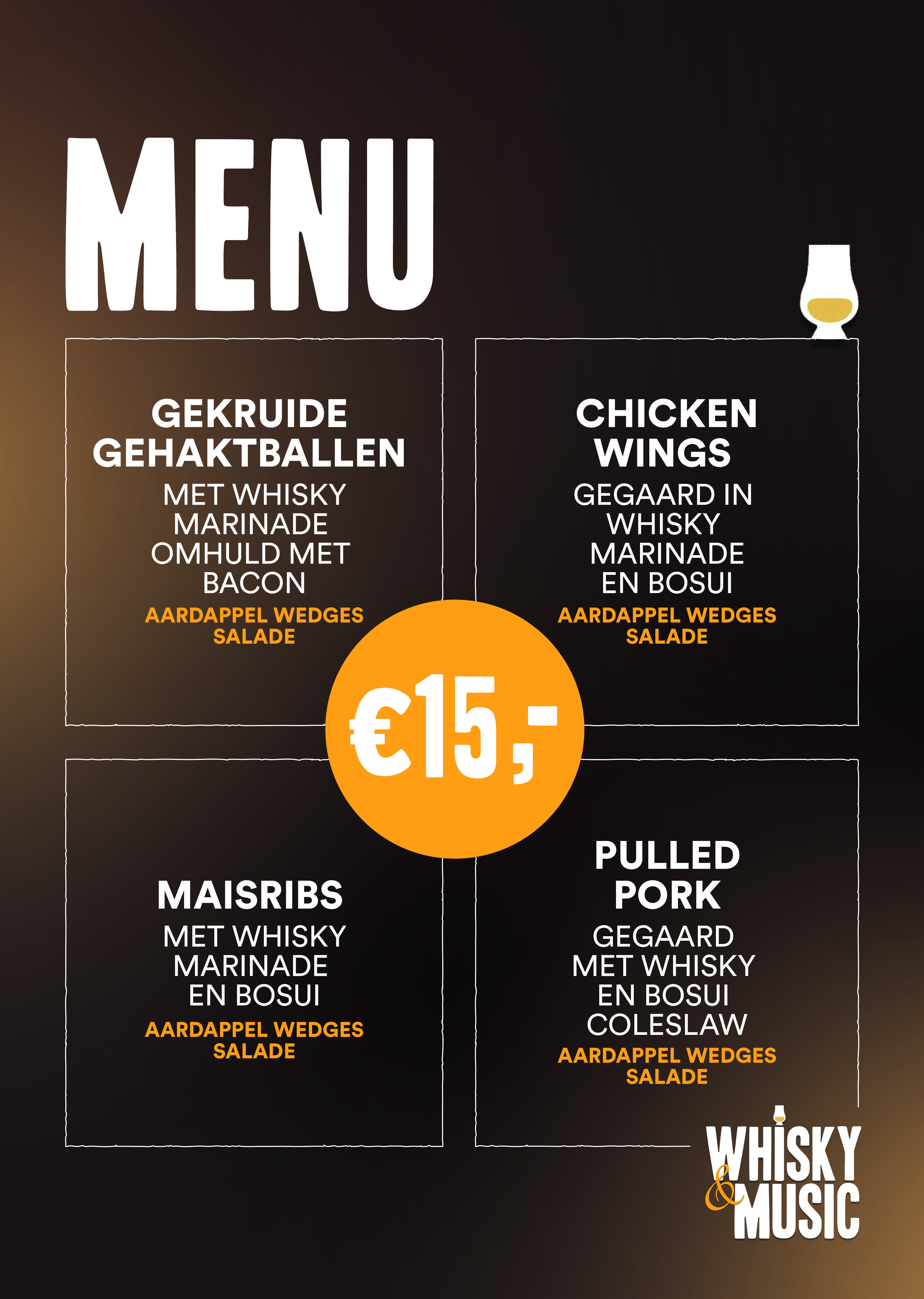 Een hapje eten? Tijdens Whisky & Music kun je in ons Muziekcafé genieten van een speciaal menu. Wat dacht je bijvoorbeeld van gekruide gehaktballen of maisribs? Bekijk alle specials hier.